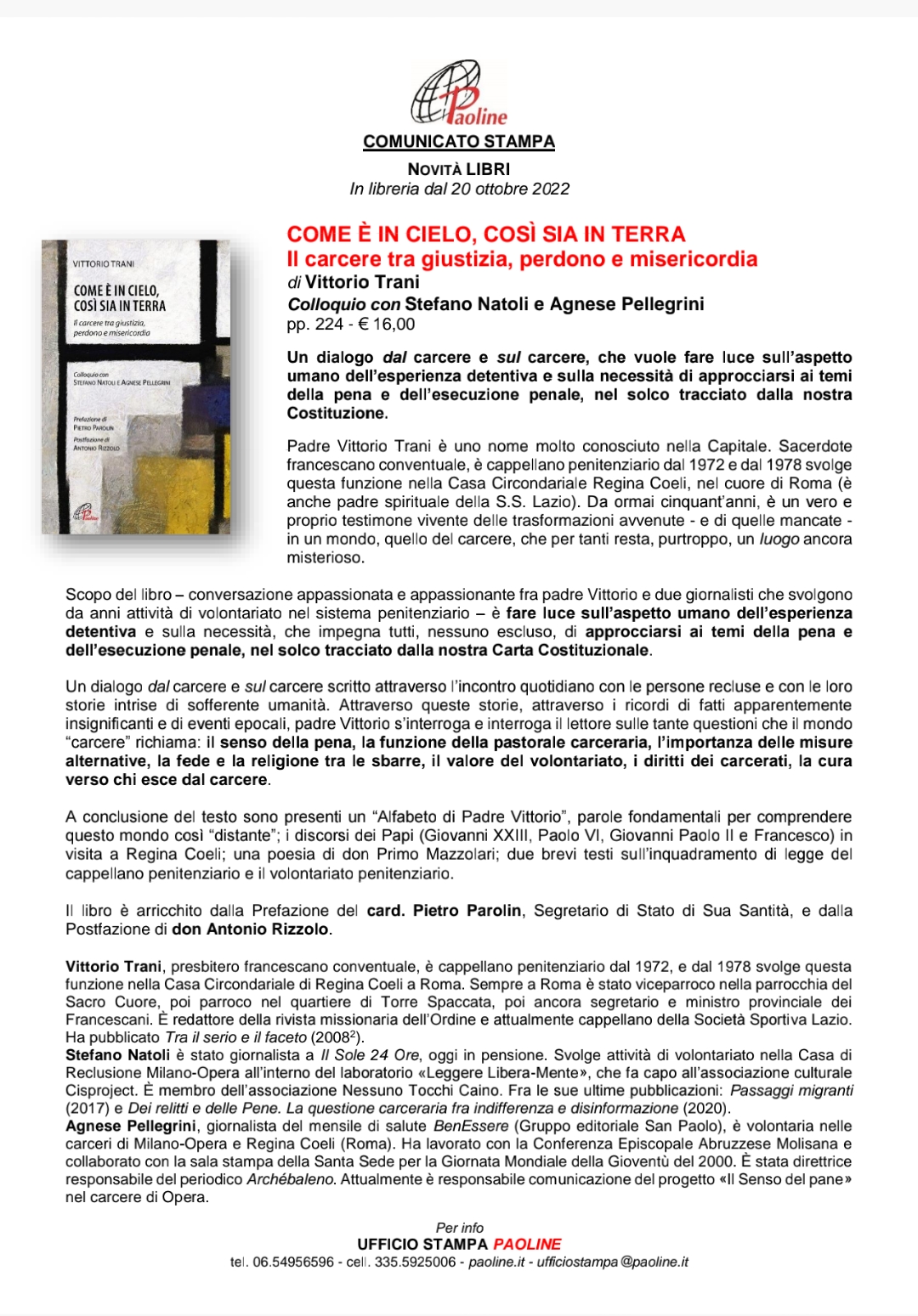 Lo scopo del libro - conversazione appassionata e appassionante fra un cappellano e due giornalisti (Stefano Natoli e Agnese Pellegrini) -: far luce sull'aspetto umano dell'esperienza detentiva e sulla necessità - che impegna tutti, nessuno escluso - di approcciarsi ai temi della pena e dell'esecuzione penale nel solco tracciato dalla nostra Carta Costituzionale. Una sorta di diario del carcere e sul carcere scritto attraverso l'incontro quotidiano con le persone recluse e con le loro storie intrise di sofferente umanità.